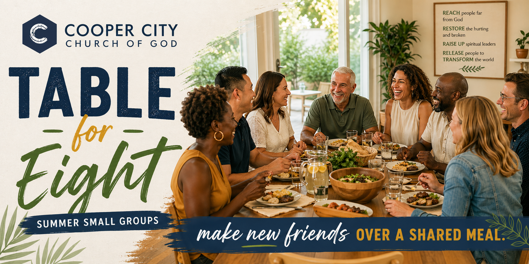 What is Table for Eight? Table for Eight is a casual fellowship opportunity where you can connect with others from our church community. Groups meet one time in the month of June to share a meal and conversation. The setting is flexible – homes, restaurants, parks, or anywhere your group chooses. You don't need to be a gourmet chef to participate – the focus is on building new relationships and enjoying time together.